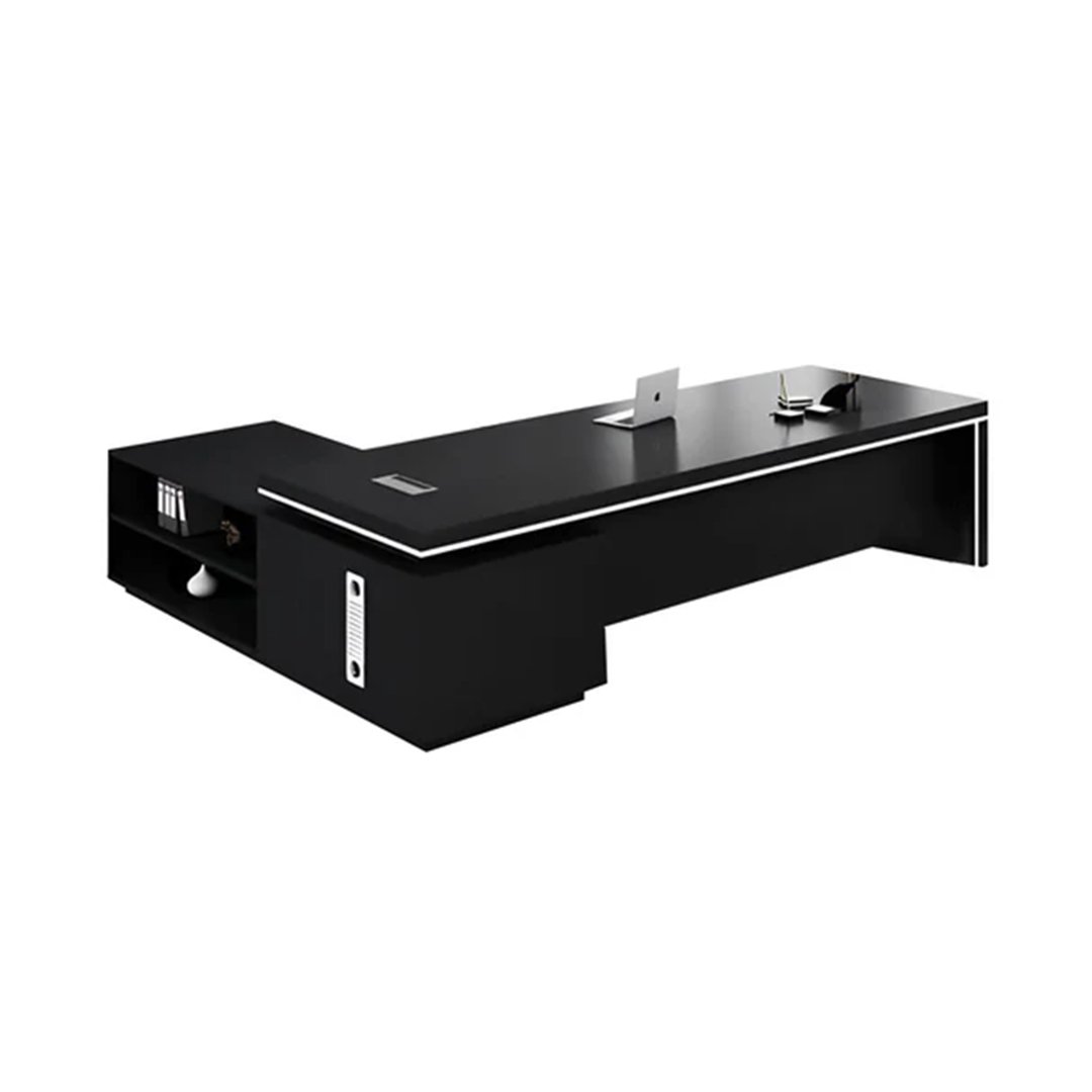 من خلال الصور، يظهر المكتب بخطوط مستقيمة واضحة وواجهة أمامية صلبة تمنحه حضورًا إداريًا قويًا وهيبة واضحة داخل المكتب. سطح العمل الواسع يوفر مساحة مريحة لتنظيم اللابتوب، الملفات، المستندات، والإكسسوارات المكتبية دون ازدحام، مما يساعد على زيادة الإنتاجية وتنظيم بيئة العمل.